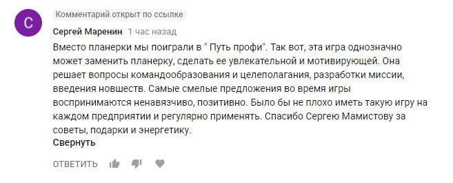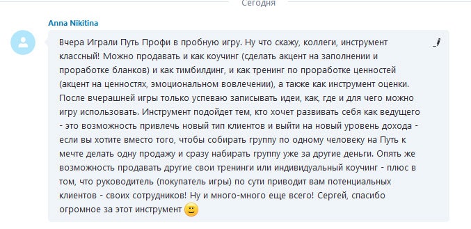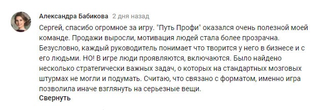 Друзья!!! Я как всегда в приятном шоке от игр Сергея!!! Вчера играли в "Путь героя" и я всё время спрашивала "как так точно говорится всё про меня?". Множество инсайтов и реальных дел напланировано!!! Цель теперь кажется не такой масштабной, а вполне легко осуществимойߒ㠐ꑀоме этого сработало волшебство подбора участников - и через другого игрока я проработала второй свой запросߘ鰟䝰 Ну а теперь о фактах после игры: Проиграли мы вчера до 11 вечера, и один из запросов (сложностей) был вопрос работы с командой. Через пол часа после игры мой дизайнер активизировалась и до 2х часов ночи мы сделали работу, которую я ждала больше 2х месяцев. Причем понимали друг друга с полуслова, сходились сразу в идеях!!! Сергей!!! Благодарю за новое волшебство ߙ